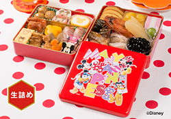 紀文だけのオリジナルのディズニーデザインのお重の中には、紀文の技が活かされたおせち料理や、ミッキーのかまぼこなど、バラエティー豊かな食材が入っています。
